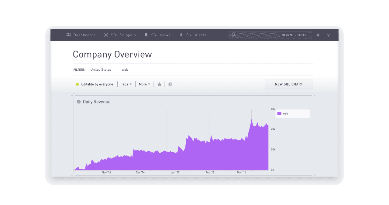 Dig deeper and analyze charts without ever touching SQL code. Perfect for investigating a blip in the data and reducing data request volume.
